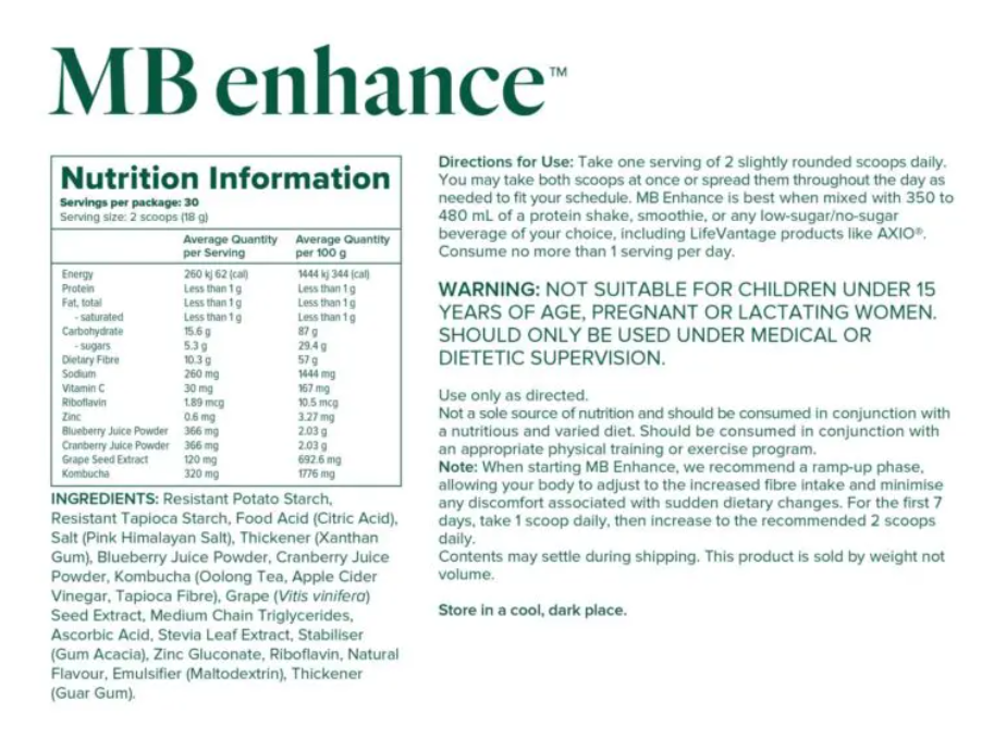 - MB Enhance™ is delicious mixed in with smoothies, protein shakes, or other beverages. The cranberry and blueberry extract gives it a subtle berry taste.